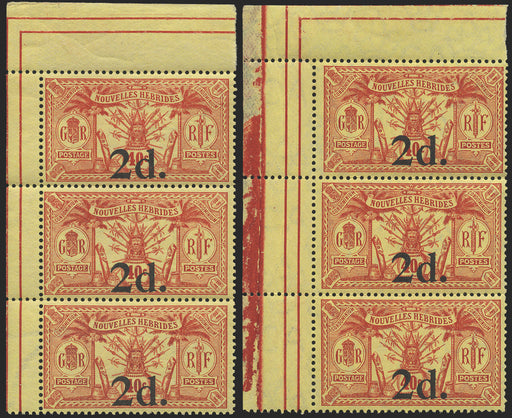£375.00| /New Hebrides 1920-21 '2d.' on 40c red/yellow, French issue, watermark 'RF' in sheet, upper left corner vertical strip of 3, SG35. A very fine unmou...