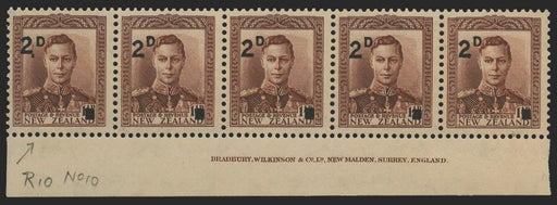 £425.00| /New Zealand 1941 2d on 1½d purple-brown, horizontal imprint strip of 5, showing variety Inserted '2' on first stamp (R10/10), SG629a. A fine unmoun...