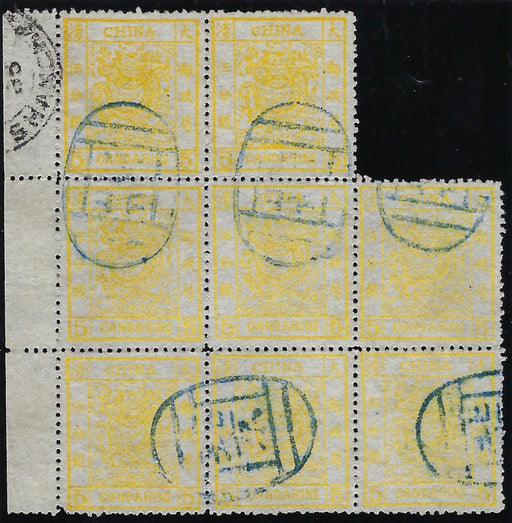 £15,000.00| /China 1883 5ca chrome-yellow 'Candarins', thicker paper, 2½mm spacing, clean-cut perforations, irregular 'L' shaped block of eight from setting VI ...