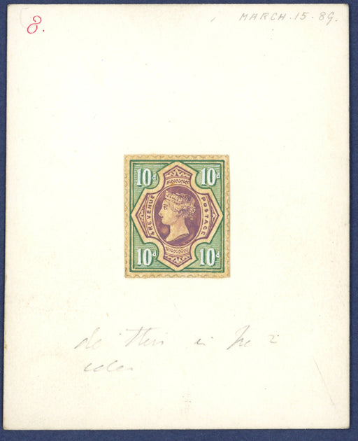 £8,000.00| /Great Britain 1889 10d "Jubilee" essay, SG210var. A very fine hand painted example in lilac & green with details of the design highlighted in C...