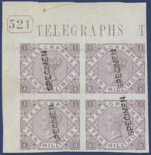 £1,100.00| /Great Britain 1877 10s colour trial Telegraphs, Plate 1, SGT16svar. A very fine imperforate unmounted mint, with full original gum, corner marginal...