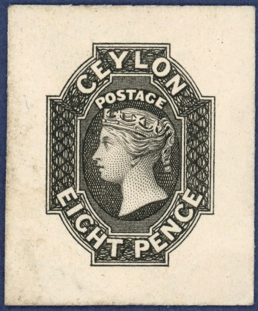 £5,500.00| /Ceylon 1857-59 8d die proof in black on India paper (30x36mm) affixed to card, SG7var. Some trivial soiling evident at left, although remains an at...