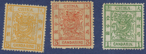 £3,250.00| /China 1878 1ca green, 3ca brown-red and 5ca orange, 'Large Dragons', thin paper 2¼mm spacing, SG1/3. Fine mint examples with large part original gu...