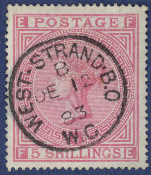 £3,800.00| /Great Britain 1882 5s rose, Plate 4 (white paper), SG134. A very fine used well centred example lettered 'FE', beautifully cancelled by a crisp Wes...