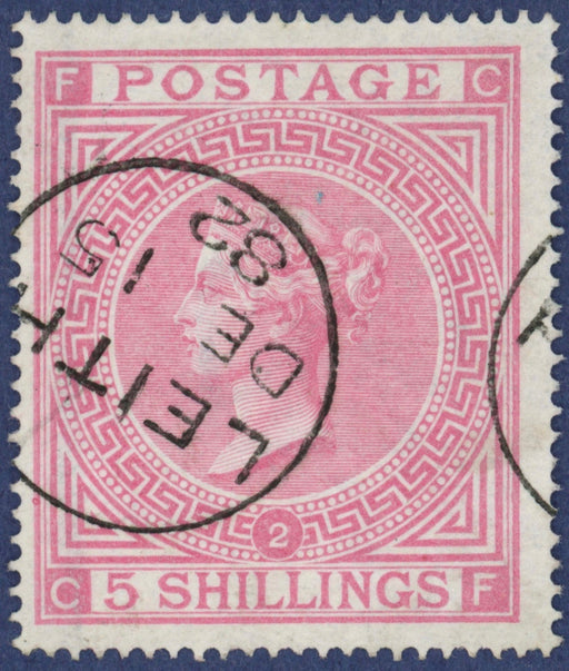 £1,350.00| /Great Britain 1874 5s pale rose Plate 2, SG127. An exceptionally fine used example lettered 'CF', beautifully cancelled by a crisp Leith circular d...