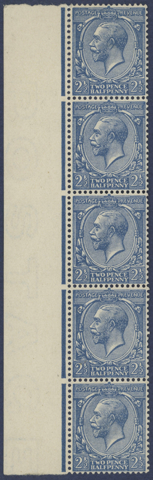£4,500.00| /Great Britain 1912 2½d pale blue variety, SG372var. A very fine unmounted mint, with full original gum, left hand marginal vertical strip of five s...