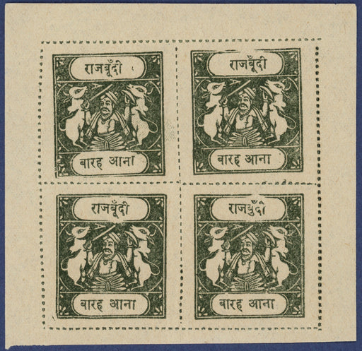 £275.00| /Indian Feudatory States Bundi 1918 12a blackish-green tablet Type D on thin wove paper, Benns setting 17, as complete sheet showing printing variet...