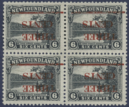 £3,250.00| /Newfoundland 1929 (23 Aug) 3c on 6c slate, type 101 surcharge in red, ERROR SURCHARGE INVERTED, in a very rare block of 4, SG188a. A brilliant qual...