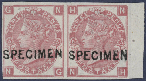 £1,000.00| /Great Britain 1867 3d rose Plate 5 Specimens, SG103s. A very fine and fresh unused, with original gum, imperforate horizontal pair lettered 'NG-NH'...