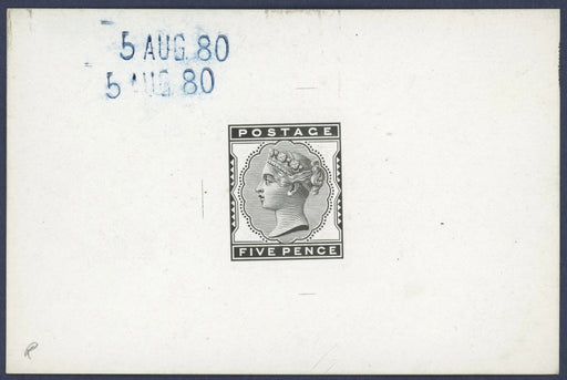 £975.00| /Great Britain 1880 5d Indigo die proof, SG169var. A superb example printed by De La Rue in black on white glazed card (92x61mm) dated twice "5 AUG ...