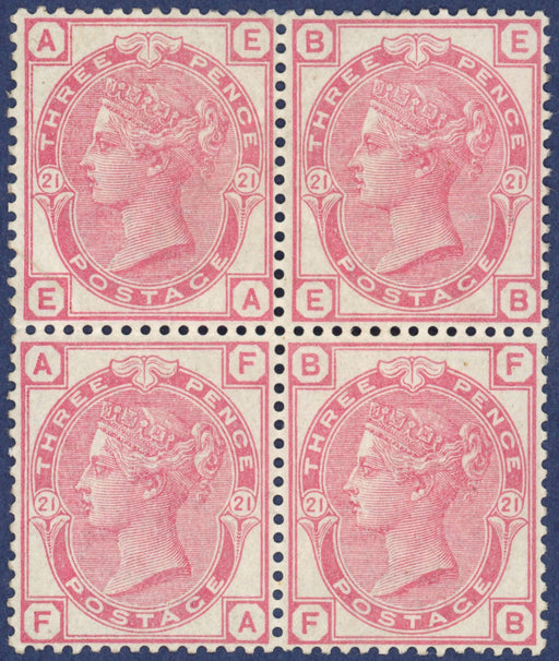 £3,000.00| /Great Britain 1881 3d rose Plate 21, SG158. A superb well centred unmounted mint, with full original gum, block of four lettered 'EA-FB'. Lovely co...
