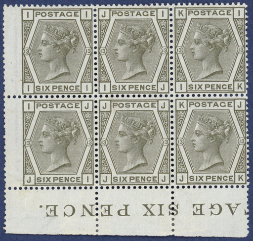 £4,250.00| /Great Britain 1874 6d grey Plate 13, SG147. A very fine and fresh unused, with original gum, bottom margin left hand wing margin block of six lette...