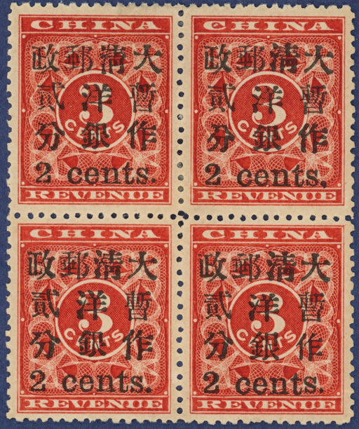 £7,000.00| /China 1897 'small' surcharge 2c on 3c deep red 'Red Revenue' 2c on 3c, SG93/d/f. A remarkable block of four including printing variety 'comma for s...