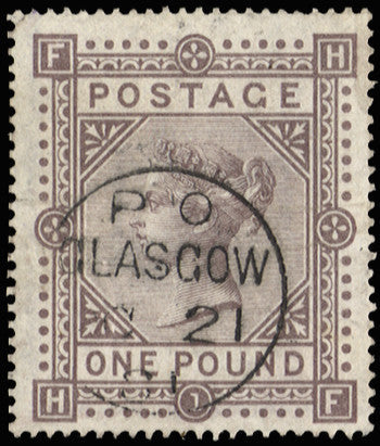 £4,500.00| /Great Britain 1878 £1 Brown lilac Plate 1. Very fine used well centred example lettered HF, neatly cancelled by a crisp Glasgow circular date stamp...