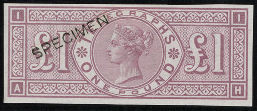 £600.00| /Great Britain 1877 £1 Telegraph colour trial, SGT17var. A superb unused, with original gum, imperforate example lettered 'AH', printed in dull mauv...