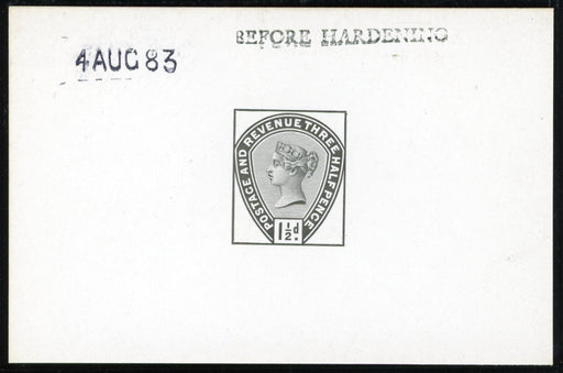 £1,200.00| /Great Britain 1883 1½d die proof, SG188var. A very fine example without comer letters printed in black on white glazed card, endorsed "BEFORE HARDE...