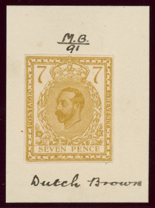 £900.00| /Great Britain 1911 7d Hentschel essay. A very fine imperforate colour trial printed in dutch brown (Manders Bros ink No.91) on white unwatermarked ...