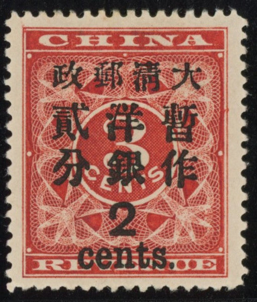 £550.00| /China 1897 (Jan) 2c on 3c deep red "Red Revenue", 'Large’ surcharge type 19, SG89. A fine and fresh mint example with large part original gum. In 1...