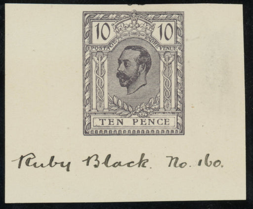£900.00| /Great Britain 1910 10d Hentschel colour essay. A very fine example printed in blackish purple on white wove paper (44 x 36mm) with manuscript “Ruby...