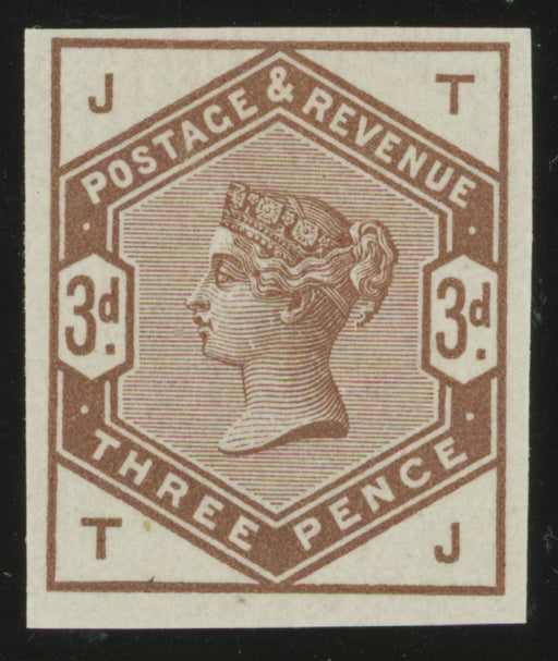 £1,750.00| /Great Britain 1884 3d Colour trial, SG191var. A very fine imperforate example printed on white gummed Crown watermarked paper in brown lettered TJ....