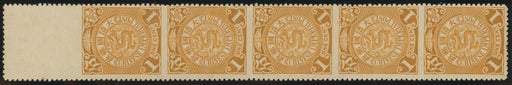 £1,200.00| /China 1900-06 1c ochre unwatermarked CIP, upper marginal vertical strip of five, SG122b. Showing error imperforate between stamps including between...
