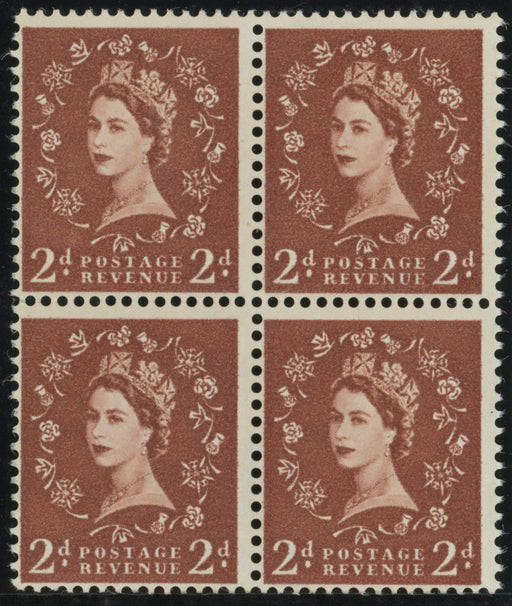 £800.00| /Great Britain 1958 2d light red brown (crisp print) "Dollis Hill Phosphor Trial”, SG573var. A very fine perforated block of four on gummed unwaterm...