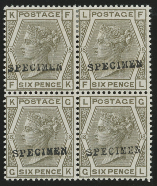 £1,000.00| /Great Britain 1882 6d grey Plate 18 Specimens, SG161s. A very fine and fresh unused, with original gum, block of four lettered 'FK-GL' (the bottom ...