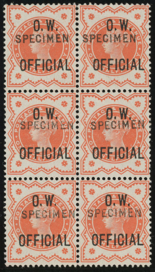 £1,500.00| /Great Britain 1896 ½d vermilion (O.W. Official), SGO31var. A brilliant unmounted mint, with full original gum, block of six overprinted "SPECIMEN" ...