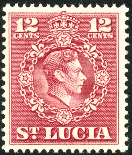 £750.00| /Saint Lucia 1949-50 12c claret, perforations 14½x14, SG153a. A fine unmounted mint example with full original gum. A very scarce and handsome King ...