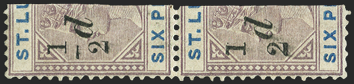 £300.00| /St Lucia 1891-92 ½d on half 6d dull mauve and blue, bisect provisional, vertical pair, the lower stamp variety 'No fraction bar', SG54a. A fine qua...