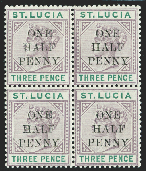 £275.00| /St Lucia 1891-92 "ONE HALF PENNY" ½d on 3d dull mauve and green (Die II), type 6 surcharge, block of 4, SG56. A brilliant mint block with original ...