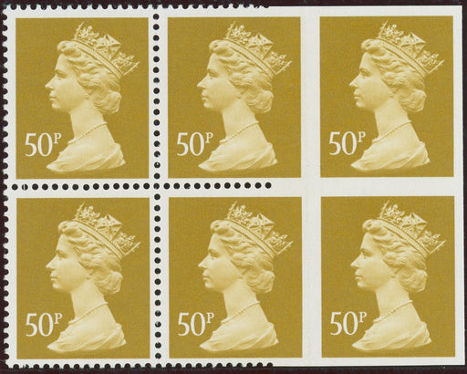£1,500.00| /Great Britain 1992 50p ochre "Machin" (ACP/PVAD) error, SGX991ab. A very fine unmounted mint, with full original gum, block of six, the right hand ...