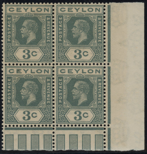 £5,750.00| /Ceylon 1921-32 3c slate-grey, script watermark, variety WATERMARK SIDEWAYS, SG340a. A fine unmounted mint, with full original gum, block of 4 from ...