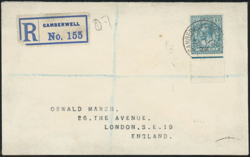 £5,000.00| /Great Britain 1924 10d turquoise-blue, SG428. A very fine used marginal example tied to a "Marsh registered envelope by a crisp Camberwell Green SE...