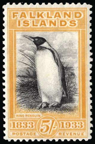 £950.00| /Falkland Islands 1933 Centenary 5s black and yellow 'Penguin', brilliant original gum. 5,577 sold (both shades). This stamp is quite simply a maste...