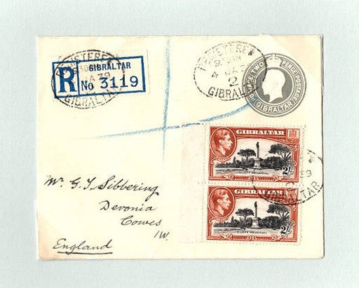 £150.00| /Gibraltar 1939 (4 JA) King George V 2d grey on cream P/S envelope (120 x 94mm), additionally franked by 1938-51 2s black and brown, marginal vertic...