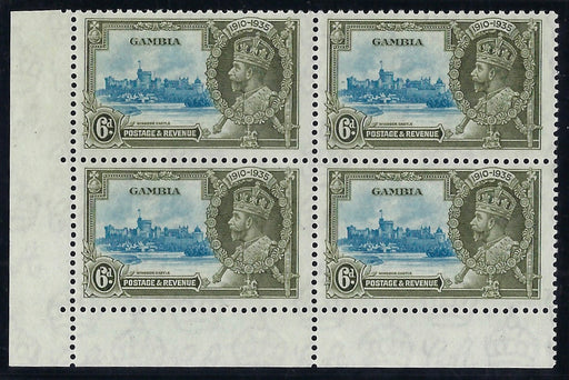 £150.00| /Gambia 1935 Silver Jubilee 6d light blue and olive-green, lower left corner block of 4 from vignette plate '1', showing variety 'Extra flagstaff' o...