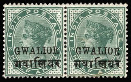 £195.00| /I.C.S. Gwalior 1899-1911 QV ½a yellow-green, horizontal pair from Feb 1903 printing, showing variety 'Tall R' (broken state) on right stamp (R20/2)...