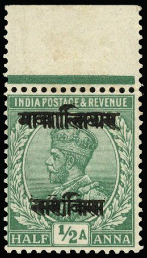 £150.00| /I.C.S. Gwalior Official. 1913-23 ½a emerald, error overprint double, upper marginal, fine original gum. Only one sheet existed. Official. SG O52ba ...