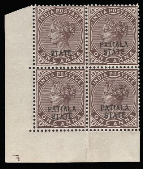£495.00| /I.C.S. Patiala 1891-96 1a plum, lower left corner block of 4 from Dec. 1898 printing, showing error 'PATIALA omitted' on R19/1, brilliant original ...