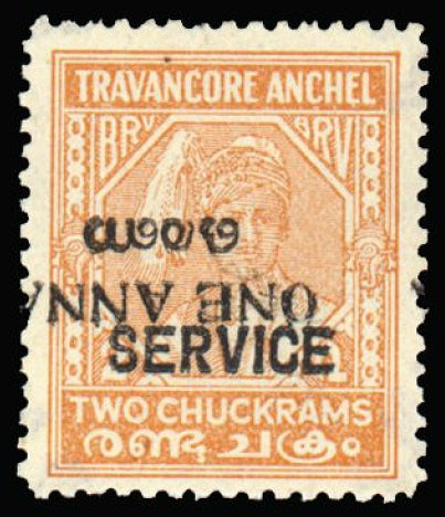 £120.00| /I.F.S. Travan-Cochin Official. 1949-51 1a on 2ch orange, type 01 'SERVICE' overprint, perforation 12½, error surcharge inverted, fine unused. A spe...