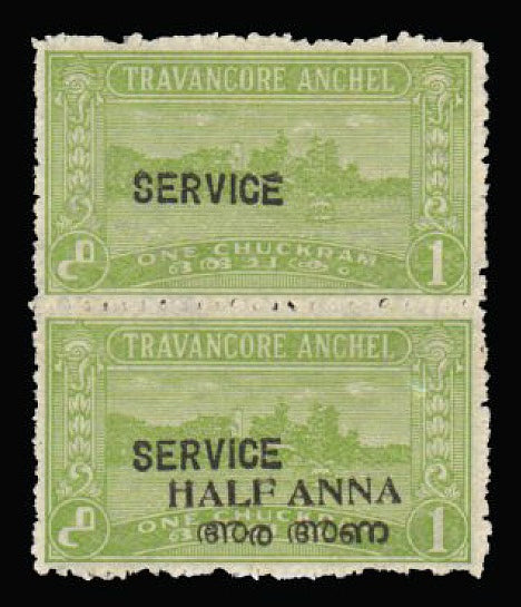 £200.00| /I.F.S. Travan-Cochin Official. 1949-51 ½a on 1ch yellow-green, type 01 'SERVICE' overprint, perforation 12, vertical pair, the upper stamp error wi...