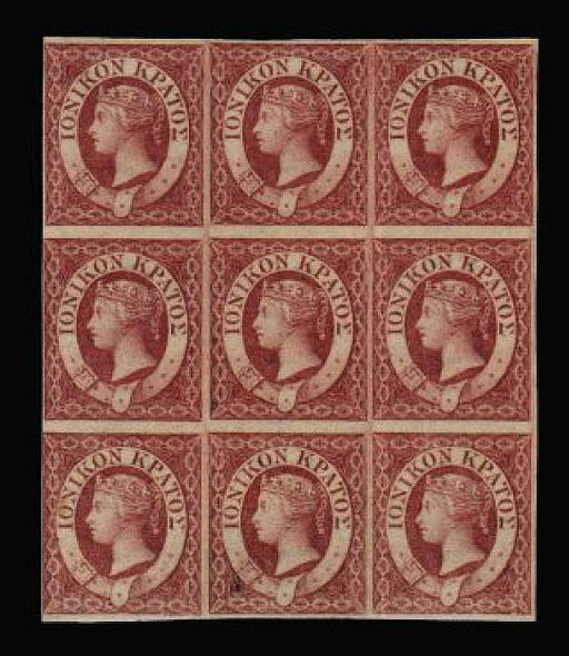 £350.00| /Ionian Islands 1859 (2d) carmine, block of 9 with large margins, brilliant original gum (hinge traces on bottom row only). Light crease between sec...
