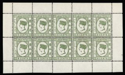 £350.00| /Labuan 1894 6c bright green, litho printing, complete sheet of 10 (5x2), brilliant unmounted original gum. R2/4 shows variety 'No dot at upper left...