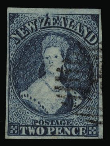 £130.00| /New Zealand 1862 2d deep blue (worn plate), watermark large star, imperforate with large to very large margins, crisply cancelled by part barred ov...