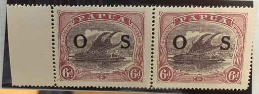£170.00| /Papua OFFICIAL. 1931-32 6d dull purple and red purple, horizontal left marginal pair showing variety 'POSTACE' for 'POSTAGE' at left (R6/2) on seco...