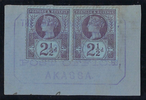£160.00| /Niger Company Territories 1897-99 Great Britain 2½d purple/blue, two examples, tied to piece by complete strike of framed 'AKASSA' type 5 ds in vio...