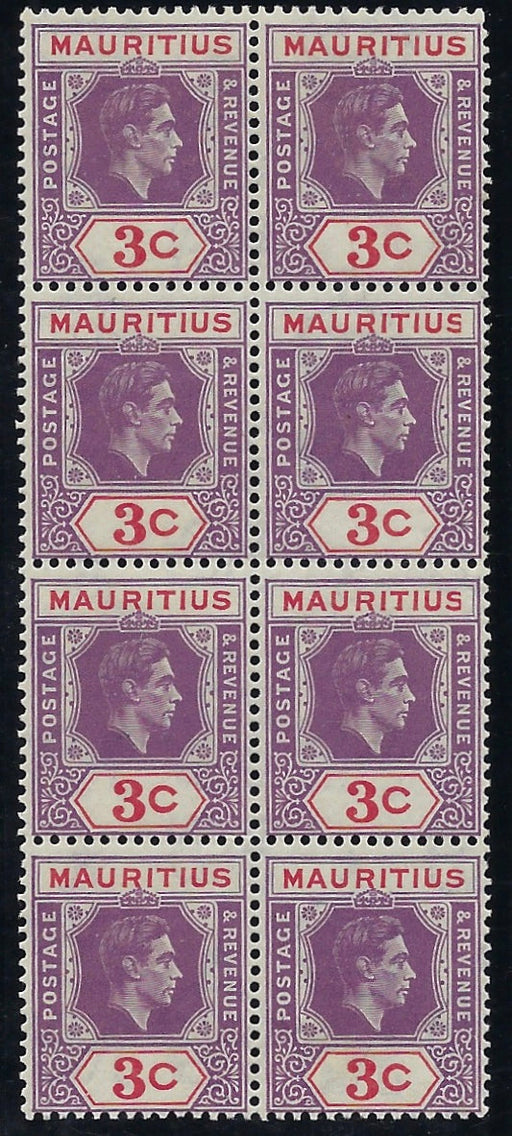 £170.00| /Mauritius 1938-49 3c reddish-purple and scarlet, block of 8 (2x4) (R1/1-4/2), showing variety sliced 'S' at right (R2/2 and 3/2) on centre right ve...