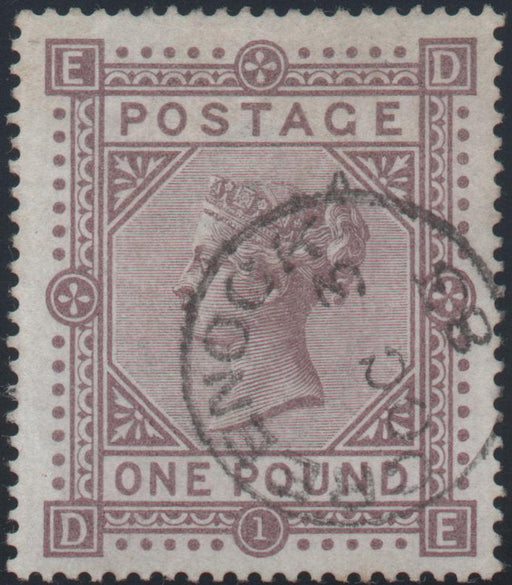 £9,000.00| /Great Britain Queen Victoria £1 Brown-Lilac, Plate 1 (white paper), used SG136. A superb well centred example lettered "DE" and cancelled by the ci...