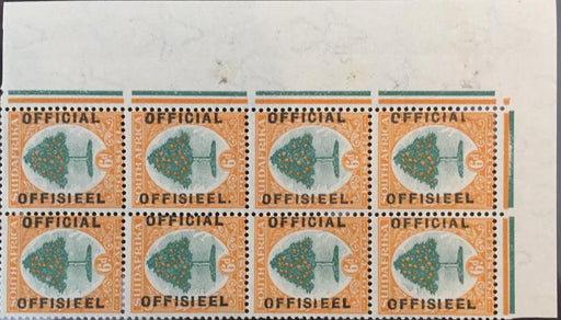 £225.00| /South Africa Official. 1929-31 6d green and orange, Pretoria typo printing with type O2 overprint, lower right corner block of 8 (2x4) from 1930 pr...